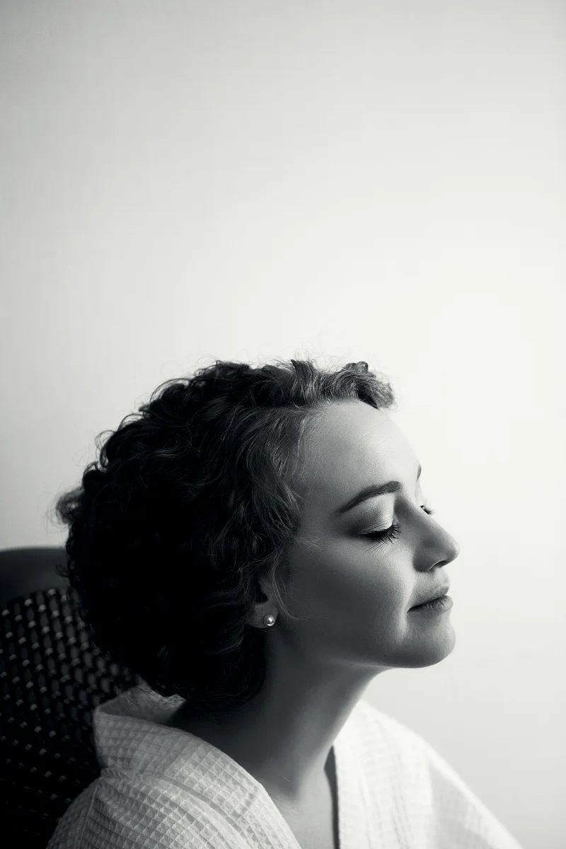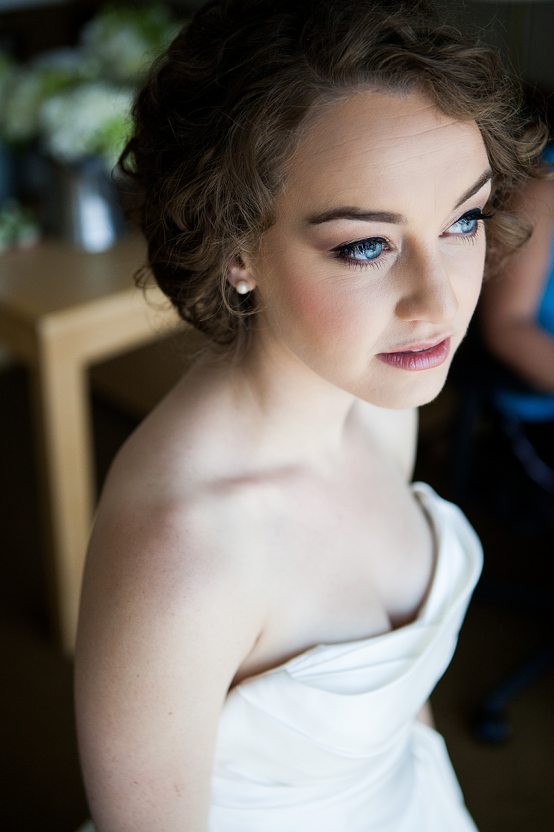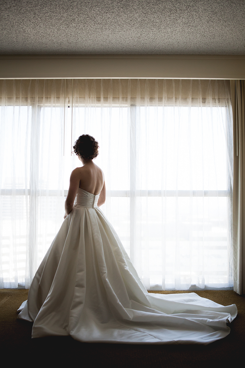 With her hair and makeup finished, Meghan donned her dress and looked out the hotel window, cool and calm.