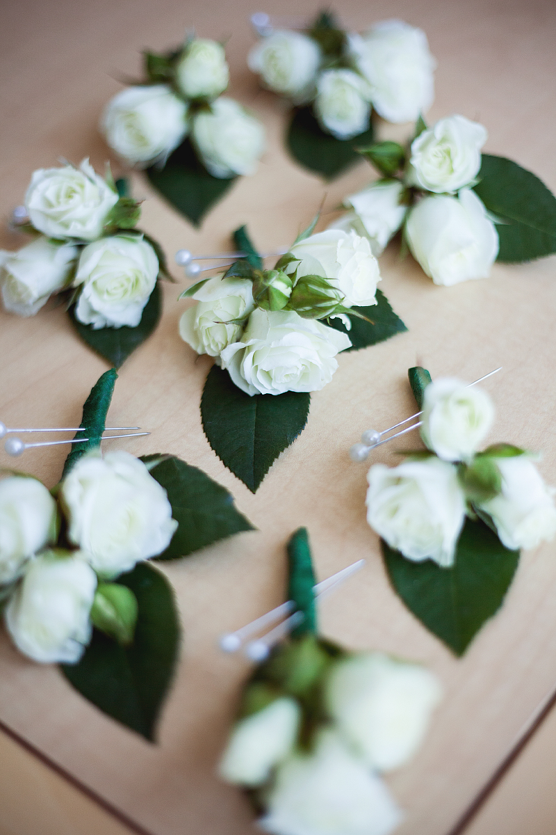 Meghan's mother assembled boutonnieres on a table as she waited for her turn to be done-up.