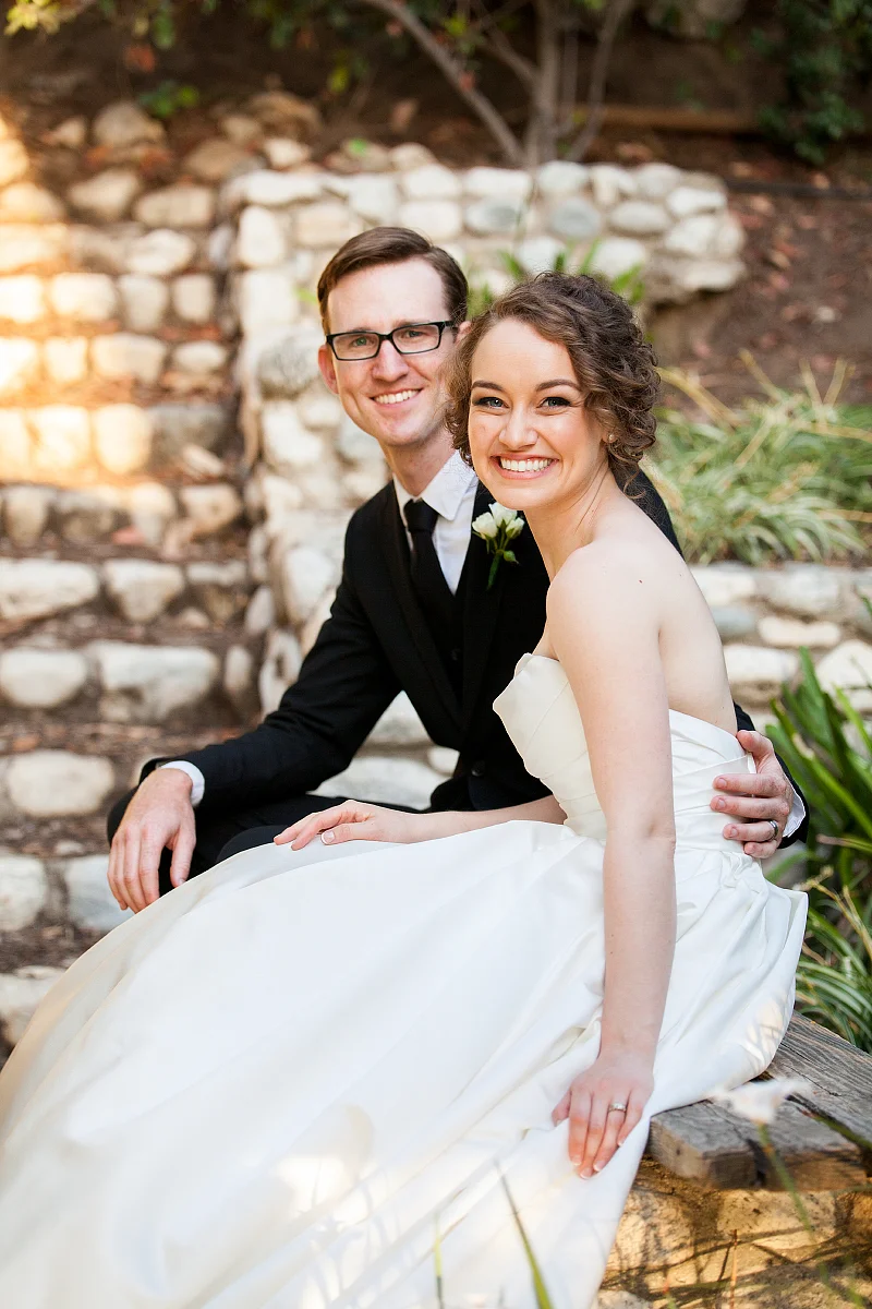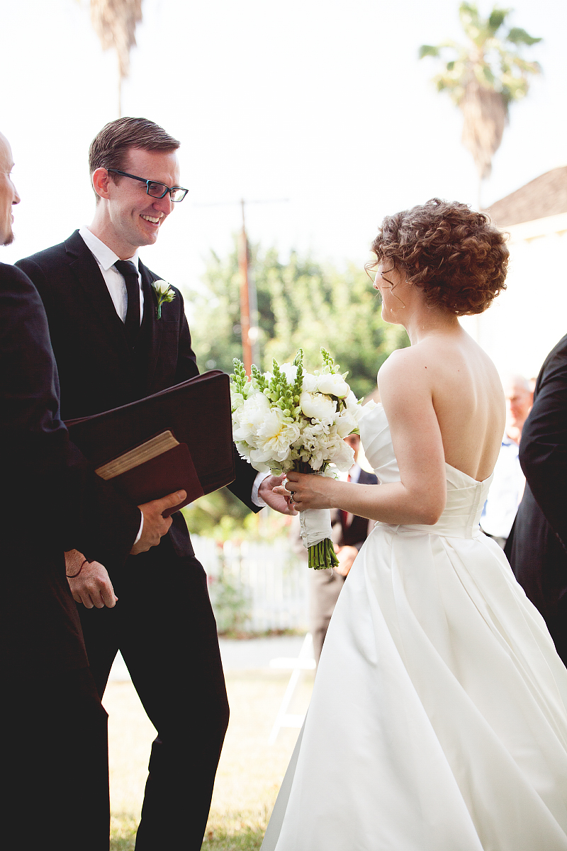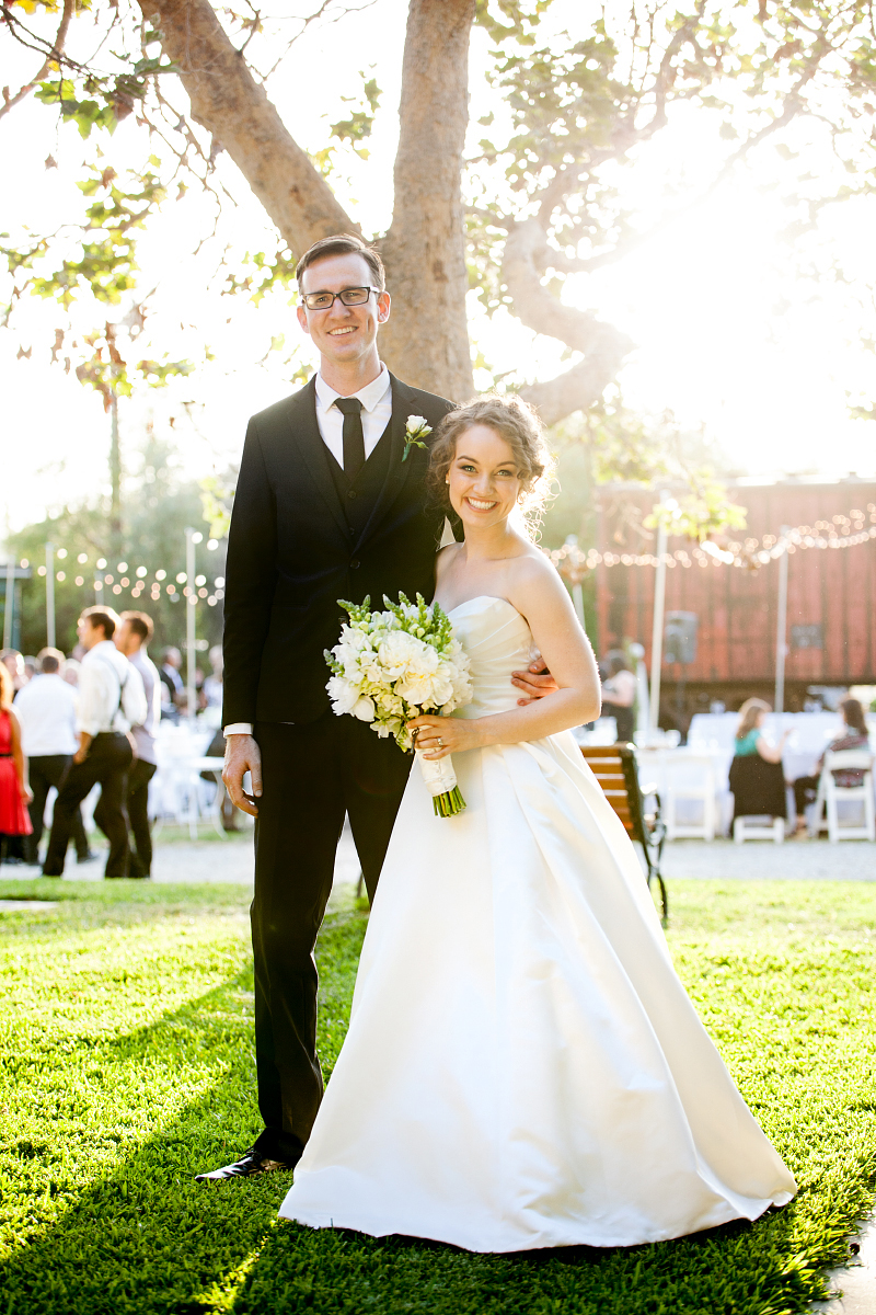 Kris and Meghan got married inside Heritage Park in Los Angeles. It's a collection of historic houses and buildings, green grass, and pretty trees.