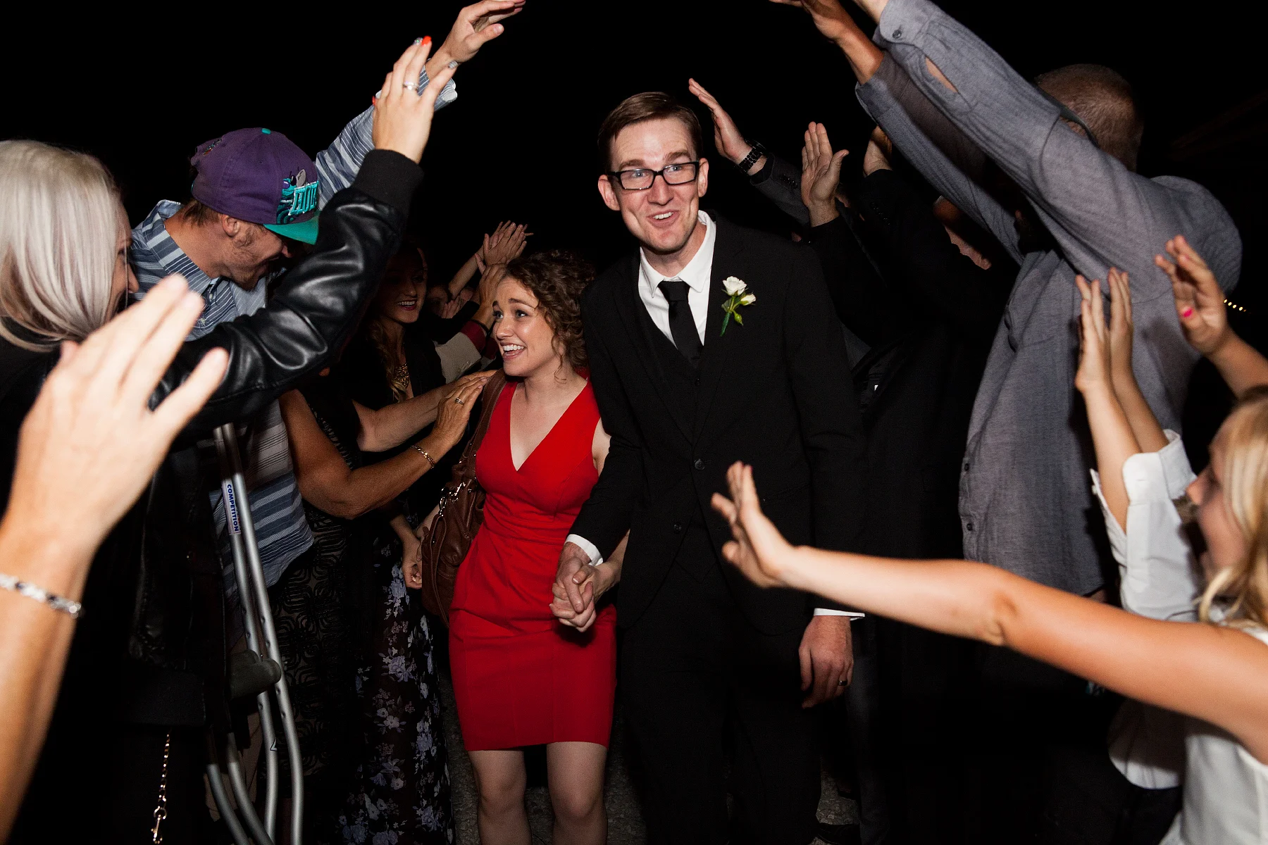 Meghan put on a bright red dress and they made their escape down a tunnel of loved ones.